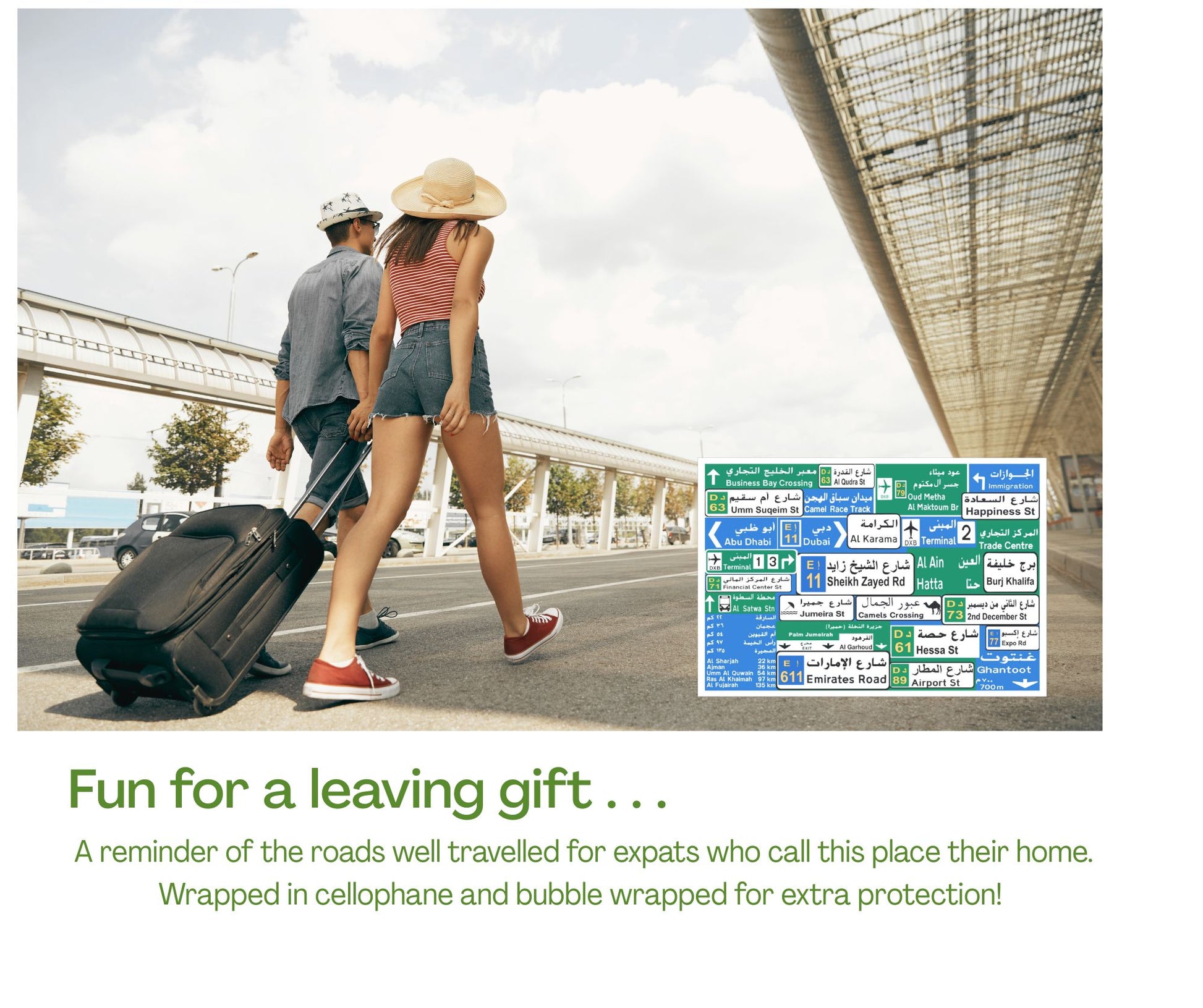 Transform your space with this Dubai street sign collage, featuring the iconic places. This premium metal sign showcases both English and Arabic text, perfectly capturing Dubai's distinctive bilingual wayfinding system. Measuring 30 x 20 centimetres, the sign is crafted with high-quality reflective material and features crisp, unique design on a durable white background. The classic rectangular design is a trip down memory lane with the street signs of Dubai. Whether mounted in your home, office, or commercial space, this sign serves as a compelling piece of Dubai's urban culture. The wall-mountable design weighs approx 75 grams and is built to last, making it an ideal choice for collectors, Dubai enthusiasts, or anyone seeking to add a unique decorative element to their interior. Perfect for creating an authentic atmosphere or adding a sophisticated touch of Middle Eastern wayfinding aesthetics to any setting.
