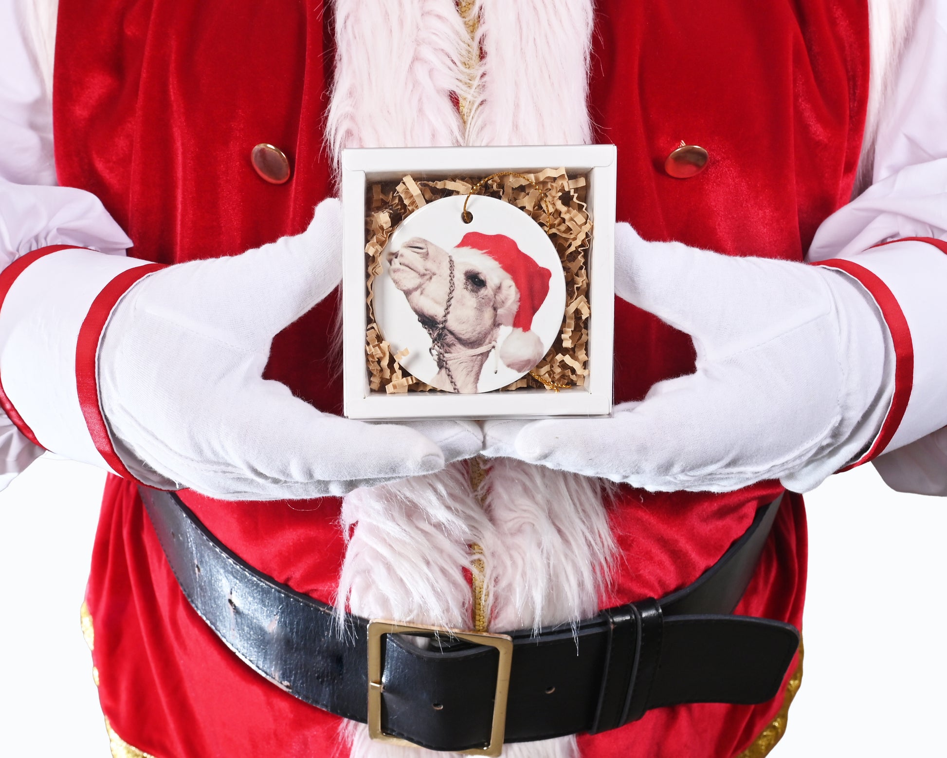 Add a whimsical touch to your holiday décor with this charming ceramic middle eastern camel ornament. The round white ornament features a delightful design of a camel wearing a festive red Santa hat, bringing together traditional desert charm with Christmas spirit. Crafted from durable ceramic material, this unique ornament comes with an elegant gold string for easy hanging on your Christmas tree or holiday display. The crisp white background makes the detailed camel portrait and vibrant red Santa hat stand out beautifully. Perfect for adding a distinctive Middle Eastern flair to your seasonal decorations, this ornament makes for a memorable holiday gift or a special addition to your own collection. The ornament arrives nestled in protective packaging, ensuring it reaches you in perfect condition. Create lasting holiday memories with this playful fusion of Christmas tradition and desert culture.